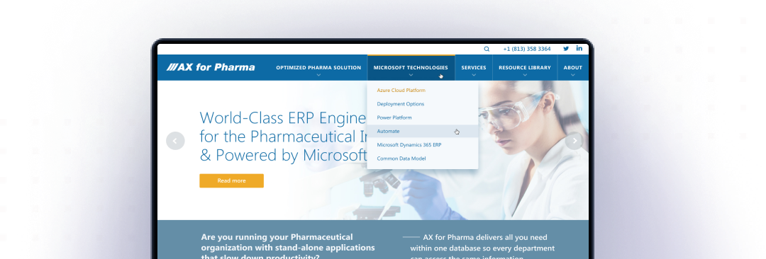 Создание сайта для разработчика официального расширения для Microsoft Dynamics 365, позволяющего фармацевтическим и биотехнологическим компаниям и производителям медицинского оборудования автоматизировать процессы производства и управлять нормативными рисками.