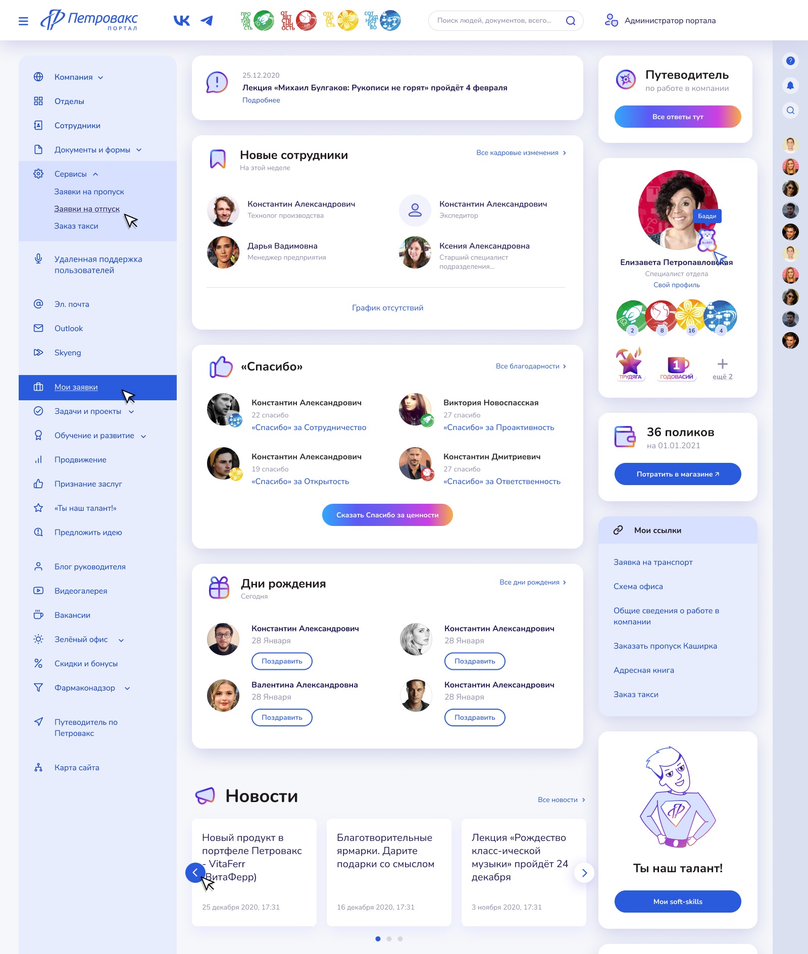 • Создание нового блока для заявок от сотрудников в разделе «Сервисы».